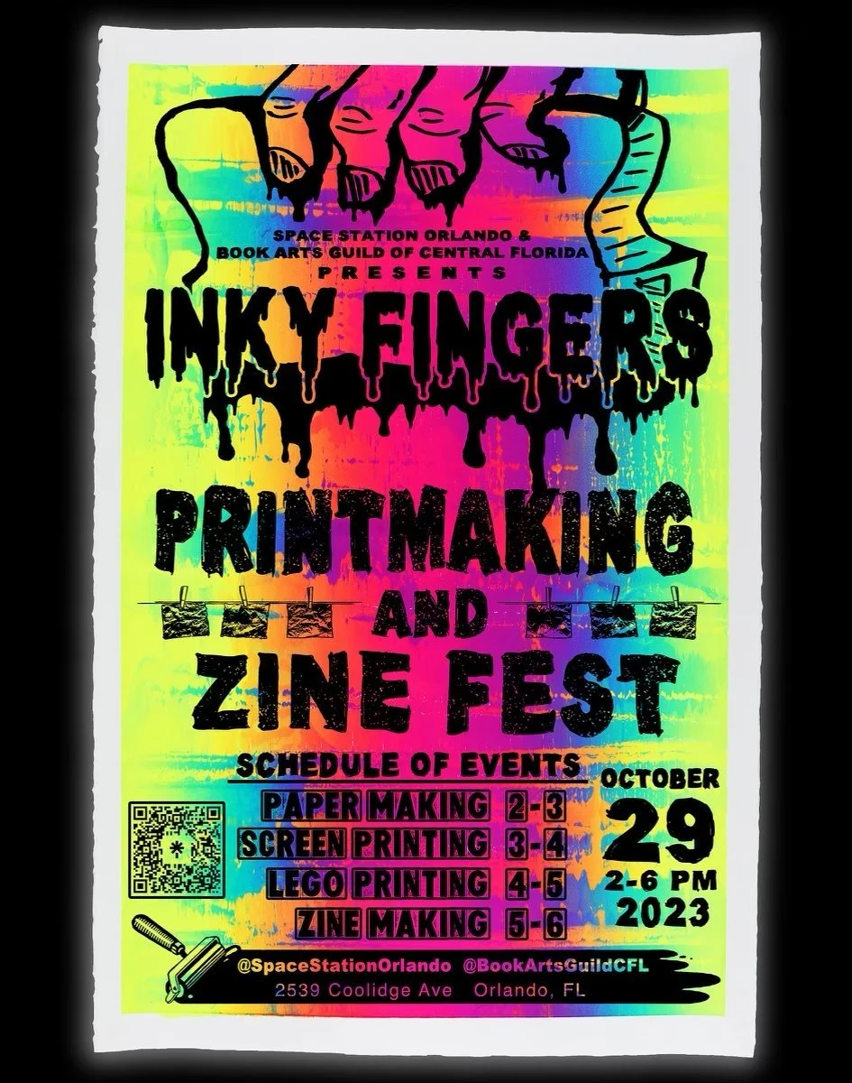 Exciting news! The guild is co-sponsoring our first printmaking and zine fest with the Space Station Orlando in College Park (2539 Coolidge Ave., Orlando)!